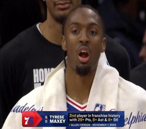 据统计,马克西是76人队史上第二位单场至少砍下29分8助攻8抢断的球员,此前只有艾弗森在2003年11月7日做到过。此外,单场8抢断也是马克西职业生涯的抢断数新高。