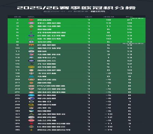 25/26赛季欧冠联赛阶段积分榜