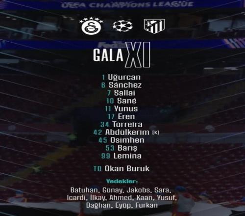 加拉塔萨雷首发:1-恰基尔、17-埃尔马利、42-巴尔达克奇、6-达文斯-桑切斯、7-罗兰-绍洛伊、34-托雷拉、99-勒米纳、10-萨内、11-阿克金、53-伊尔马兹、45-奥斯梅恩